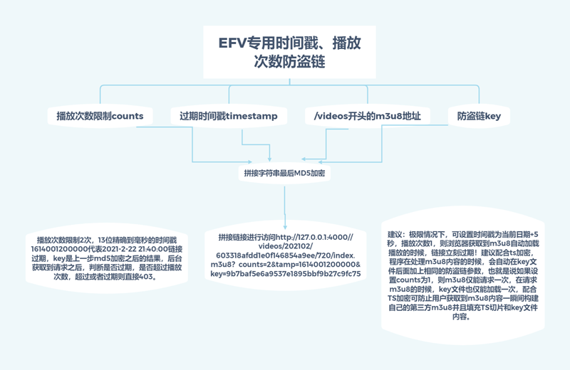 第三方应用可以很方便的对接这个防盗链功能,自行设定counts播放次数,timestamp精确到毫秒的13位过期时间戳,然后根据需要播放的m3u8地址(/videos开头m3u8结尾,无需带域名),然后使用后台设置的防盗链key进行字符串拼接之后,通过md5算法加密成32位小写key,然后再将参数拼接到url后面进行访问即可。