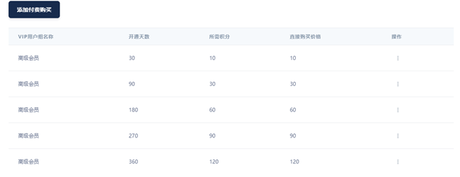 再点击EFV后台左侧 ⇒ 用户相关 ⇒ 积分购买VIP设置,点击添加付费购买,选择刚刚建的付费用户组,分别设置所有天数的购买信息,图片参考:
