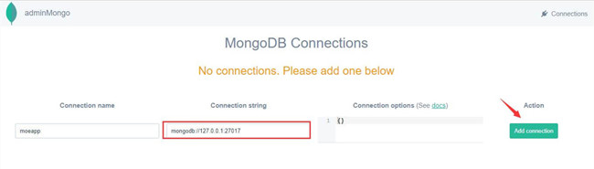 先访问http://ip:8001,然后添加本地MongoDB数据库,名称随便填,地址填mongodb://127.0.0.1:27017。