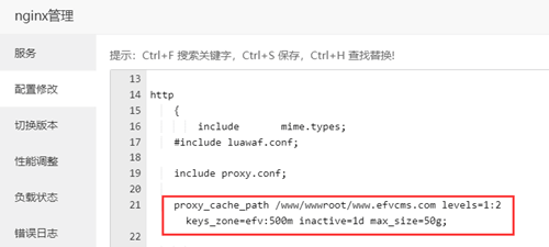 proxy_cache_path /www/wwwroot/www.efvcms.com levels=1:2 keys_zone=efv:500m inactive=1d max_size=50g;