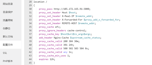 接下来再点击域名右侧设置按钮,点击配置文件,加入以下代码: