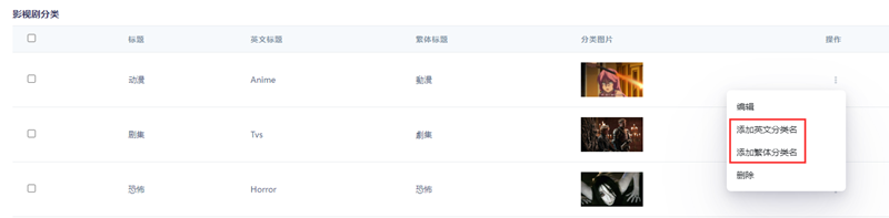 我们先设置好影视分类,然后在分类点击右侧选项,添加英文和繁体分类即可。