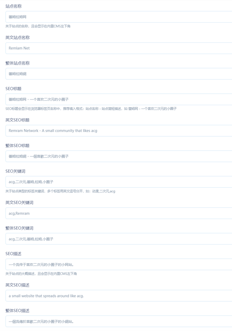 前往CMS相关的CMS设置,找到下方的站点名称、SEO标题、SEO描述、SEO标签,根据说明仔细填写,如图: