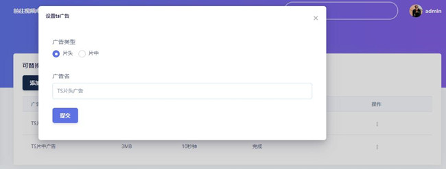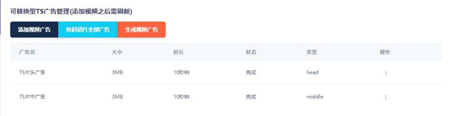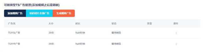 目前程序支持动态加切片广告,也就是只要你设置了片头、片中视频,则立马生效,即预览所有已转码的视频,均可以看到该广告;如果关掉广告,则立马失效。