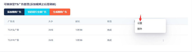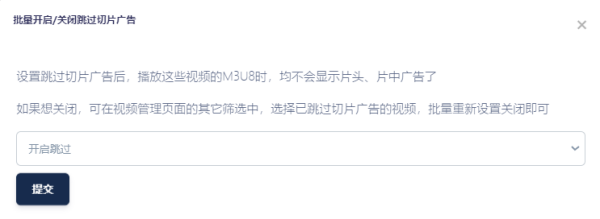 提示:切片广告为动态处理,也就是你开启切片广告后,立马对全部的视频生效;关闭后,所有视频的广告立马失效。