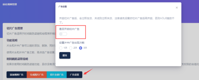 接下来点击广告设置,开启切片广告,并且根据自己的需求设置片中广告显示次数,如无片中广告可不用管。